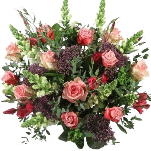Bring the timeless beauty of an English countryside garden into your home with our Vintage Garden Roses Bouquet. This elegant, hand-tied floral arrangement features a soft, romantic palette of light pink roses, white snapdragons, white phlox, and purple trachelium, artfully arranged in a loose, natural style.