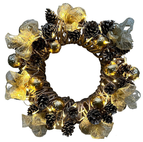 Celebrate the season with timeless beauty and a touch of sparkle with our Vintage Style Gold Festive Wreath with Lights. This elegant wreath combines classic vintage charm with a modern glow, making it the perfect centerpiece for your holiday decorations. Featuring a stunning gold-tone finish, the wreath is adorned with delicate, shimmering accents and is beautifully illuminated with soft, warm LED lights.