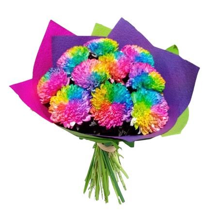 Introducing our VIP Rainbow Chrysanthemum Bouquet, a vibrant and stunning arrangement that features the enchanting Rainbow Anastasia Chrysanthemums. This bouquet is a true celebration of color, elegance, and joy, perfect for any occasion.