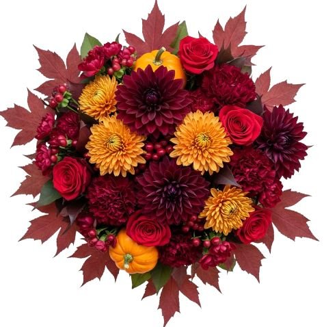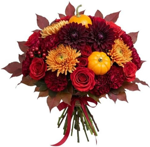 Designed to capture the essence of the autumn season, this stunning arrangement combines rich burgundy and warm orange tones, making it a perfect choice for any fall occasion.Whether you're decorating for Halloween, hosting a Thanksgiving gathering, or simply wanting to bring the beauty of autumn into your home, this bouquet is the ideal centerpiece. Its bold colors and seasonal charm make it a standout decoration for any room.