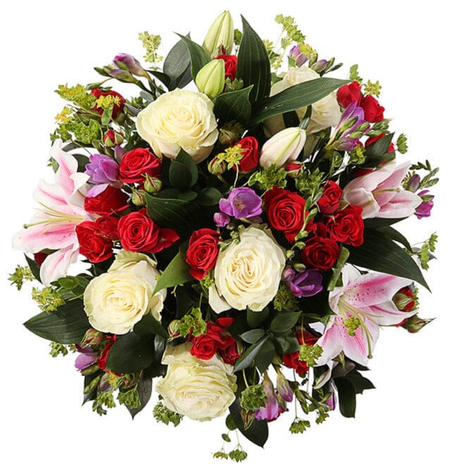 The Whispers of Elegance Bouquet is a refined and romantic flowers arrangement that captures the essence of beauty, charm, and serenity. Featuring a thoughtfully curated mix of pink lilies, red spray roses, white roses, purple freesias, and bupleurum, this bouquet is perfect for celebrating life’s tender moments or expressing heartfelt sentiments with grace. A graceful blend of soft pinks, bold reds, pure whites, and rich purples enhanced with fresh greenery. Whether it’s a romantic gesture, a heartfelt thank-you, or a gentle sympathy gift, this bouquet speaks volumes without saying a word.