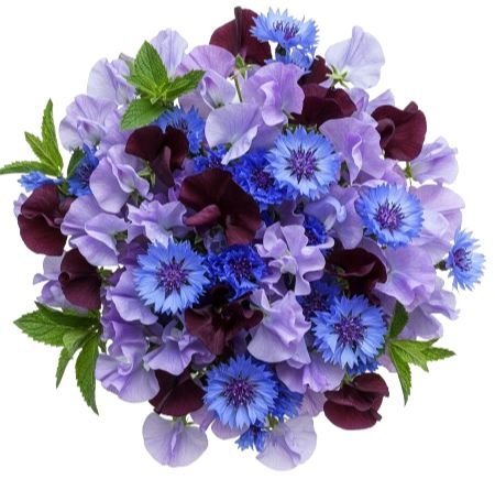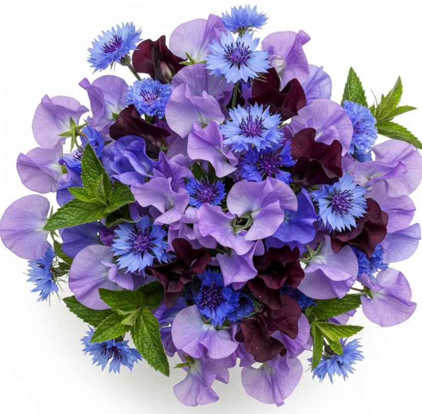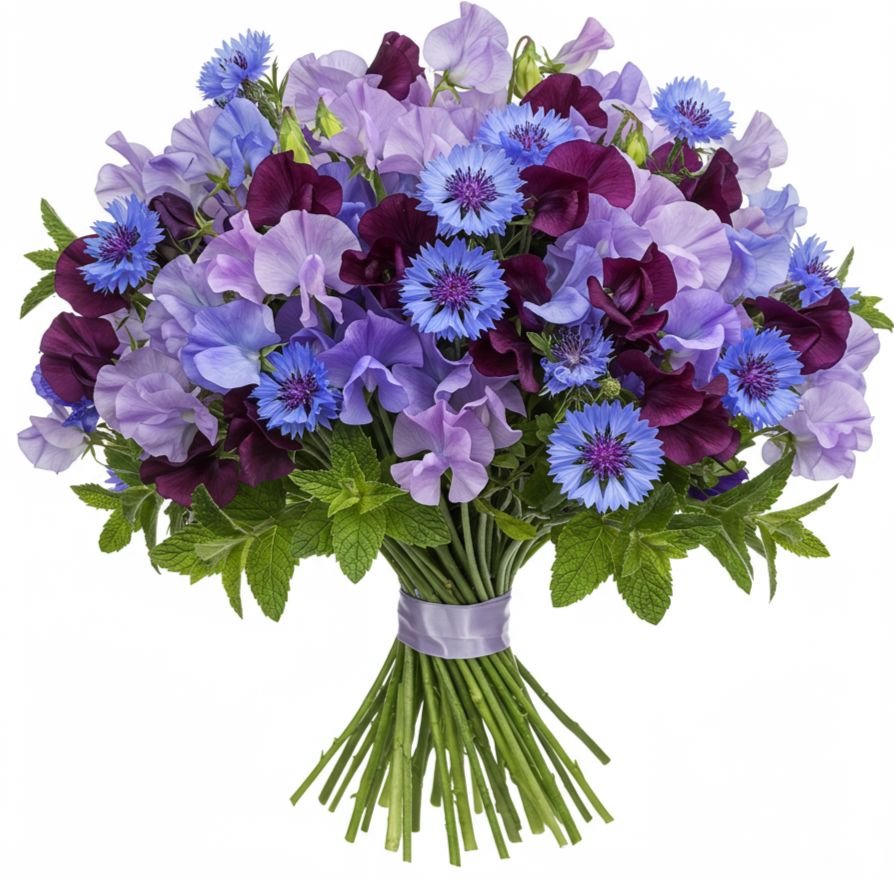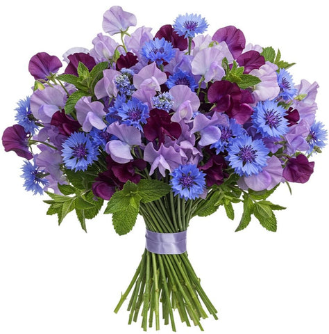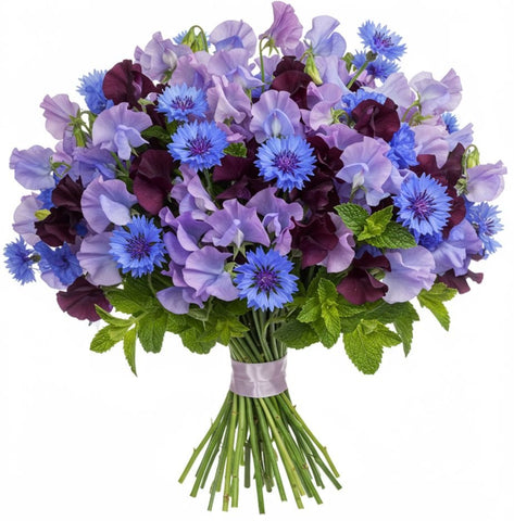 Step into a world of elegance and serenity with our Whispers of Indigo Dreams Bouquet. This unique arrangement blends delicate shades of purple, blue, and green, creating a bouquet that feels both calming and captivating. Featuring deep purple sweet pea, lavender sweet pea, blue cornflowers, and fresh mint leaves, this bouquet is the perfect balance of beauty, fragrance, and freshness. Ideal for birthdays, anniversaries, romantic gestures, or simply to surprise someone special, the Whispers of Indigo Dreams Bouquet is a gift that speaks of love, thoughtfulness, and timeless beauty.
