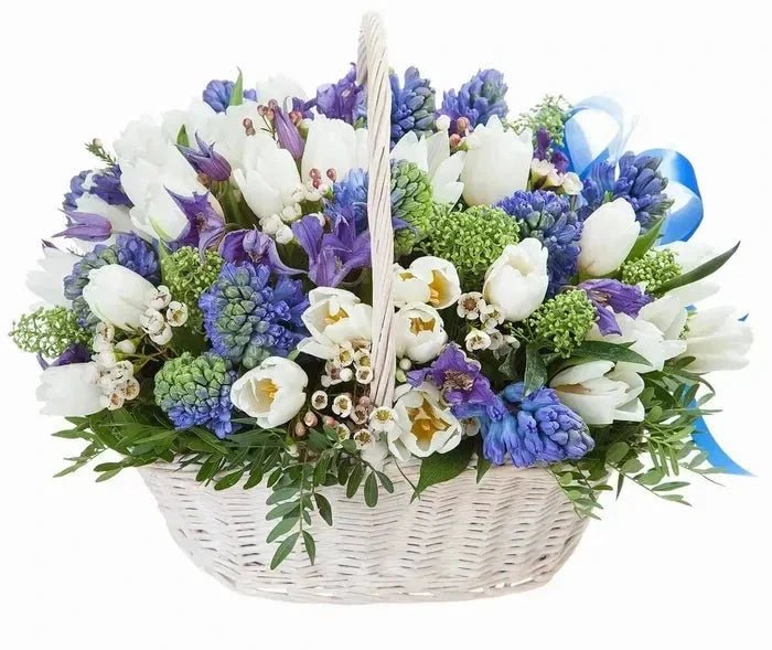 Bring elegance and charm to any occasion with the White and Blue Flowers Basket. This beautifully arranged floral gift features a harmonious blend of fresh white and blue flowers, symbolizing purity, tranquility, and grace. Perfect for birthdays, anniversaries, new baby celebrations, or sympathy gestures, this floral basket is a timeless expression of love and care.