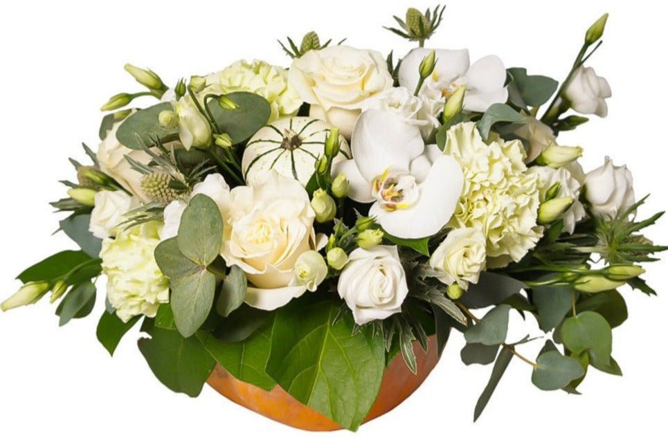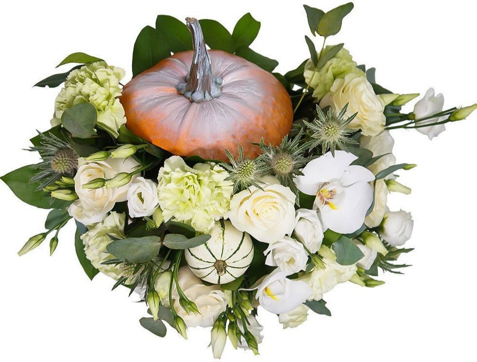 Ideal for table settings, mantel displays, or as a charming gift for friends and loved ones, the White and Green Elegant Pumpkin brings a sense of warmth and sophistication to any space. Its unique design makes it a perfect fit for both traditional and contemporary decor styles. At Flowers Box London, we are committed to creating exquisite floral arrangements that reflect the beauty of the season. With our attention to detail and dedication to quality, you can trust us to deliver a centerpiece that will impress and delight.