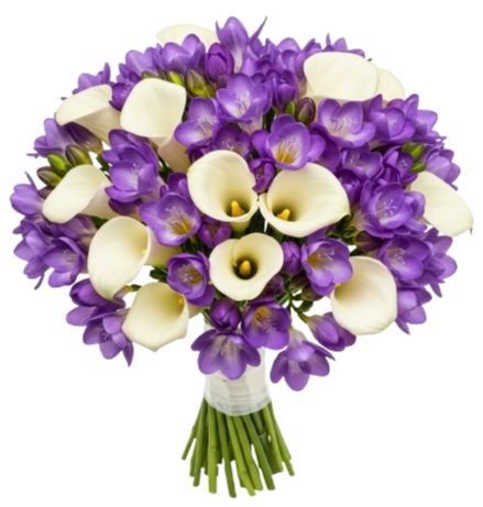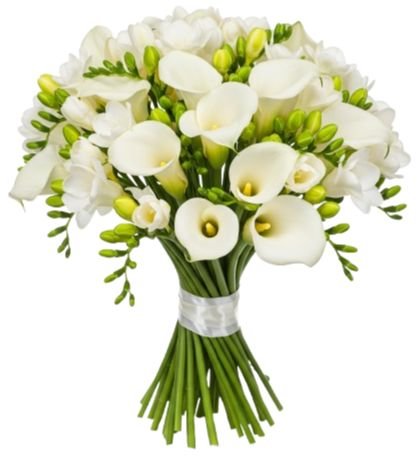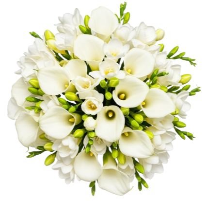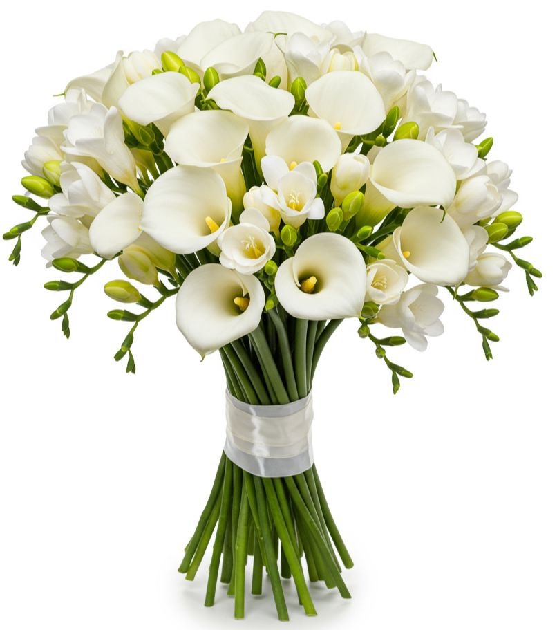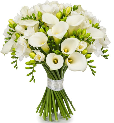 A White Calla Lily and Freesia Bouquet is an elegant and sophisticated arrangement, typically featuring a harmonious blend of soft, white fresh flowers. The bouquet is composed of long, slender calla lilies with their distinctive trumpet-shaped blooms. These lilies are paired with delicate clusters of freesia, which have multiple small, fragrant flowers on each stem. The Freesias add texture and a subtle fragrance to the bouquet, enhancing its overall elegance.
