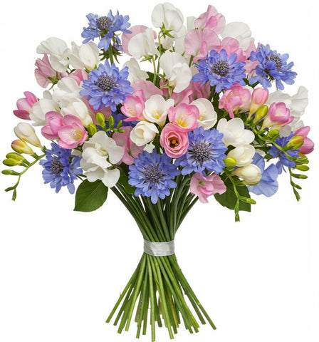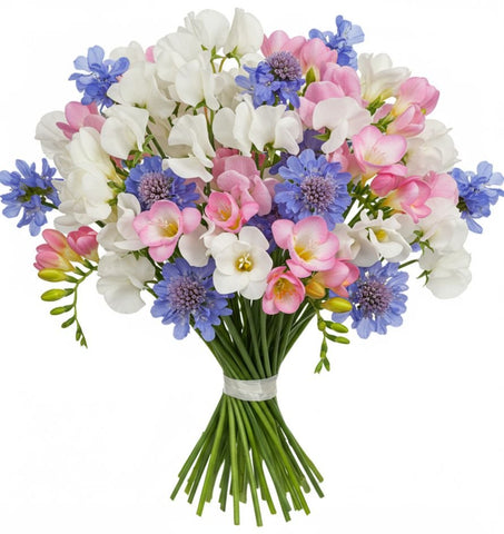 Fresh, elegant, and versatile, it’s designed to leave a lasting impression on any occasion. Perfect for weddings, anniversaries, sympathy gestures, or simply brightening someone’s day, this bouquet is a true statement of beauty and thoughtfulness.With free next-day delivery across the UK, this charming floral gift arrives fresh and beautifully presented to make a lasting impression. Bring joy and fragrance into someone’s day with the White Freesias and Sweet Pea with Scabiosa Bouquet – available for delivery across London and beyond.