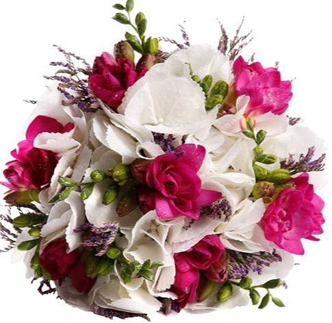 This vibrant bouquet combines soft elegance with bold pops of color, creating a stunning floral arrangement perfect for celebrations, wedding, anniversary, special occasions, or simply brightening someone’s day. Its mix of textures and hues conveys sophistication, warmth, and charm. The combination of white hydrangeas blooms, magenta freesias, and purple limonium results in a balanced and visually captivating bouquet. The mix of soft, voluminous blooms with bright, energetic accents creates a stunning display that is both elegant and cheerful, making it a perfect gift to convey appreciation, love, or celebration.