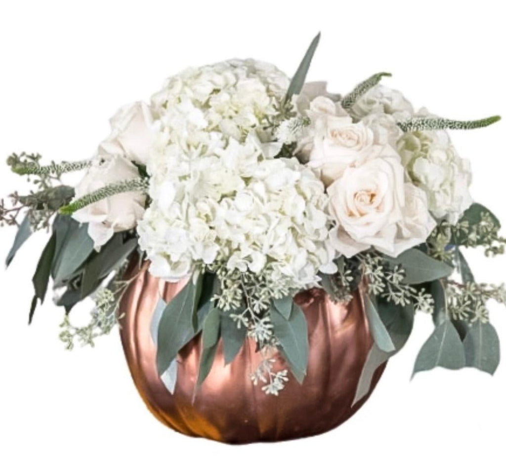 Stunning floral composition of beautiful mix of roses, veronica, and hydrangea creates a breathtaking centerpiece that stands out. Unique gifting more original than a typical bouquet, this arrangement conveys your feelings in a passionate and heartfelt way. Whether for a special event, holiday gathering, or simply to brighten up your living space, the White in Rose Gold Pumpkin Arrangement is versatile and stylish. It makes a wonderful gift for friends and family or a chic addition to your own home decor.