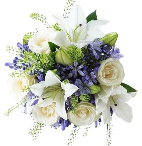 Elevate your floral gifts with the White Lily in Blue Bouquet, a sophisticated arrangement featuring elegant White Roses, pristine White Lily, striking Blue Agapanthus, and fresh green bell.