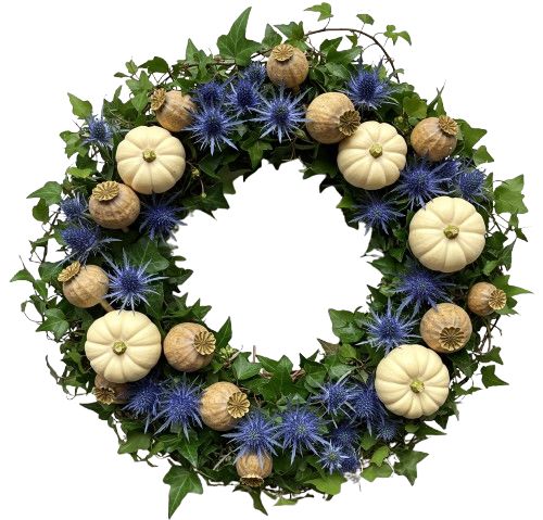 Celebrate the beauty of the season with our White Pumpkin and Blue Eryngium Wreath, a stunning combination of natural elegance and rustic charm. This handcrafted wreath features elegant white pumpkins, striking blue eryngium, delicate natural dried papaver seedpods, and lush english ivy, creating a sophisticated and timeless decoration. Perfect for autumn décor, halloween, thanksgiving, or as a stylish door or table centerpiece, this wreath adds a touch of seasonal warmth and elegance to any home. Order your White Pumpkin & Blue Eryngium Wreath from Flowers Box London and bring the natural beauty of the harvest season indoors. A beautiful, long-lasting arrangement ideal for gifting or enhancing your own festive space.