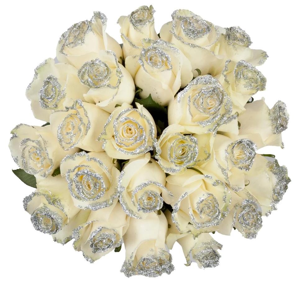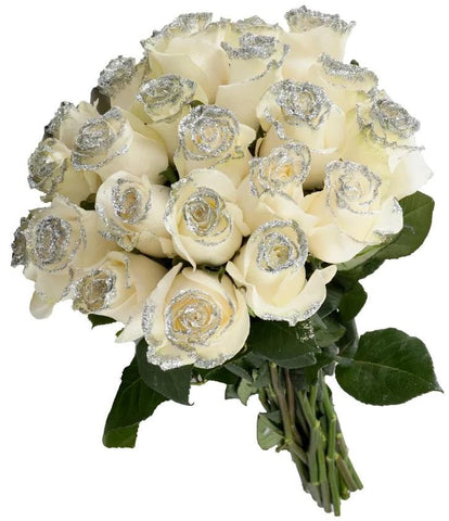 Each white rose in this bouquet is meticulously arranged and infused with a layer of shimmering silver glitter, creating a beautiful contrast that elevates the bouquet's sophistication. The result is a bouquet that glistens in the light, adding a magical touch to any setting. Whether displayed at a wedding, gifted to a loved one, or used as home décor, this bouquet radiates charm and refinement.
