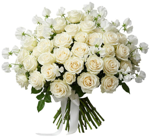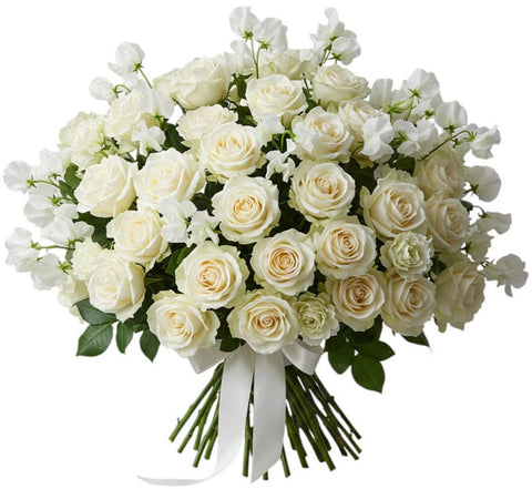 Delicate, graceful, and timeless, the White Spray Roses and Sweet Pea Bouquet is the perfect expression of love, purity, and sophistication. This stunning hand-tied arrangement brings together the classic beauty of white roses, known for symbolizing elegance and new beginnings, with the soft fragrance and delicate charm of sweet pea flowers in the color of your choice. The combination creates a bouquet that is not only visually captivating but also rich with meaning. This bouquet is perfect for weddings, anniversaries, birthdays, or as a heartfelt gift to show someone how much you care. Its versatile design makes it suitable for both romantic gestures and thoughtful everyday surprises, while its elegance ensures it stands out as a centerpiece in any room.