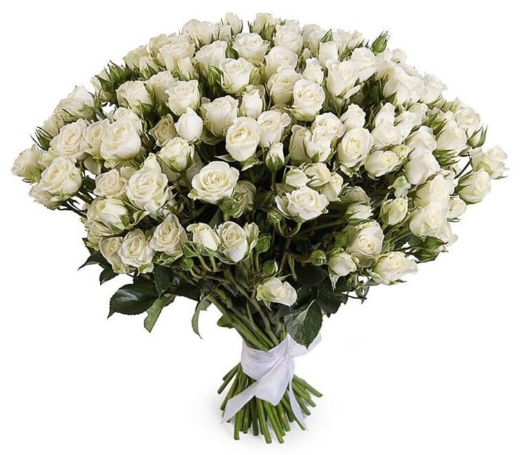The bouquet is thoughtfully arranged to showcase the natural fullness and delicate texture of the spray roses, creating an airy yet lush display. Soft greenery is often added to enhance the freshness and complement the pristine white blooms. Perfect for weddings, anniversaries, sympathy, or any occasion where a refined and understated floral gift is desired.