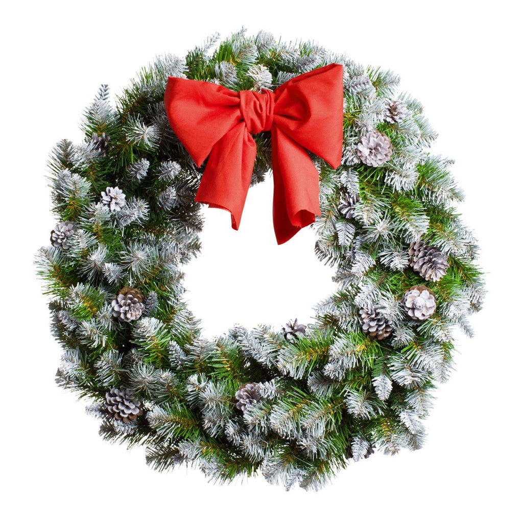 This enchanting wreath combines the beauty of fresh spruce with natural cones, adorned with a vibrant red bow for a classic touch. The addition of artificial snow gives it a frosty, wintery feel, making it perfect for both traditional and modern Christmas decor.