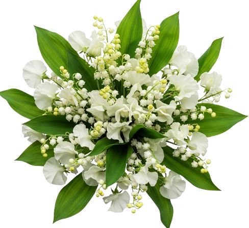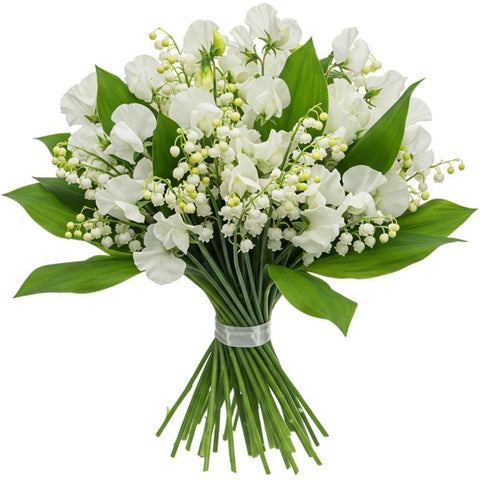 - White Sweet Pea: with its delicate petals and subtle fragrance, white sweet pea brings a sense of innocence and tenderness to the bouquet. Its soft white blooms complement the Lily of the Valley beautifully, creating a harmonious and enchanting ensemble.