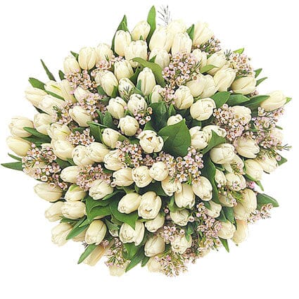The White Tulips with Wax Flowers Bouquet is an elegant and fresh arrangement that combines the timeless beauty of white tulips with the delicate, airy charm of wax flowers. The combination of white tulips and white wax flowers creates a bouquet that's both classic and understated.