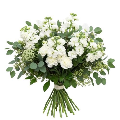 Embrace timeless elegance and soothing fragrance with our White Whisper Aromatic Bouquet. This refined floral arrangement features a carefully curated selection of fresh white stock, white sweet pea, white carnations, and populus with berry. Designed to bring calm, beauty, and understated luxury, this bouquet is perfect for weddings, sympathy gifts, or simply creating a serene atmosphere at home.