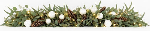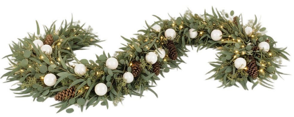 Winter Elegance Eucalyptus Garland – Fresh Greenery with White Baubles & Lights