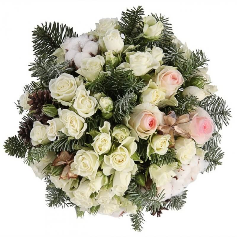 Stunning composition of white spray roses, pink roses and conifer in a box. Unique way to send flowers by post.