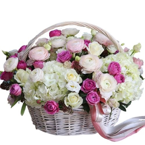Experience the delicate beauty of the Wonderful Pastel Flowers in Basket, a charming arrangement that combines soft, pastel hues to create an elegant and uplifting gift. Present a perfect blend of elegance and charm with our Wonderful Pastel Flowers in Basket, an exquisite floral arrangement featuring a harmonious combination of white hydrangea, light pink ranunculus, white roses, cerise spray roses, pink lisianthus, and a touch of red skimmia.