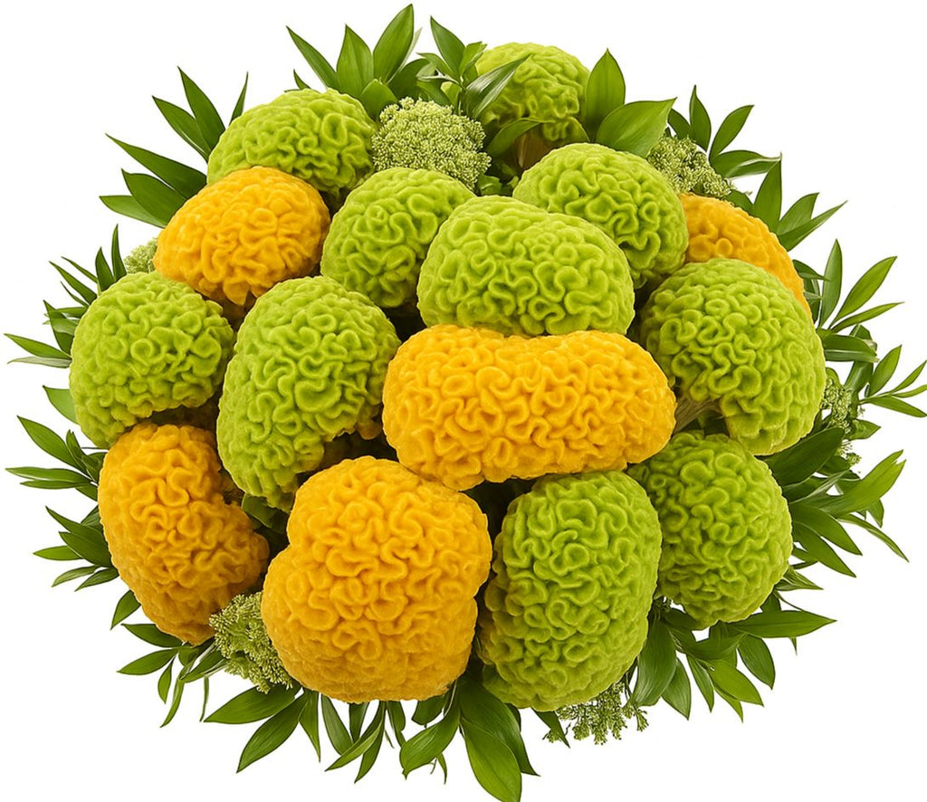 - Green Celosia: complements the yellow with its fresh, lively hue and sculptural form. Its distinctive texture and color bring balance and a modern, natural feel to the bouquet.