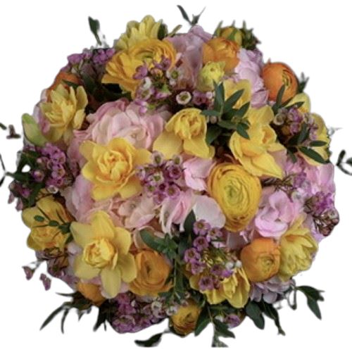 - Yellow Ranunculus: flowers symbolize charm and attractiveness. Their vibrant color adds a cheerful and uplifting touch to the bouquet.