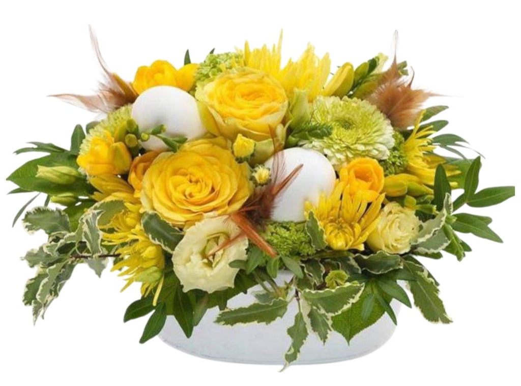 Enhanced with eggs and feathers for a playful and festive touch, along with fresh greenery to complement the blooms, this box is the perfect way to brighten someone's day and celebrate the season of hope and renewal